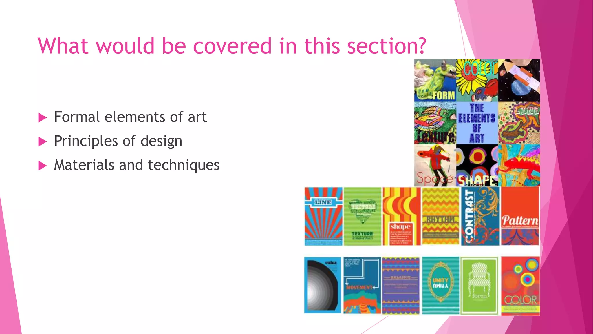 This document discusses the formal elements of art, principles of design, and materials and techniques used in visual art. It covers line, color, texture, space, shape/form, balance, contrast, emphasis, proportion, rhythm/repetition, movement, and unity. It also briefly introduces sculpture, painting, drawing, printmaking and provides references for further information.