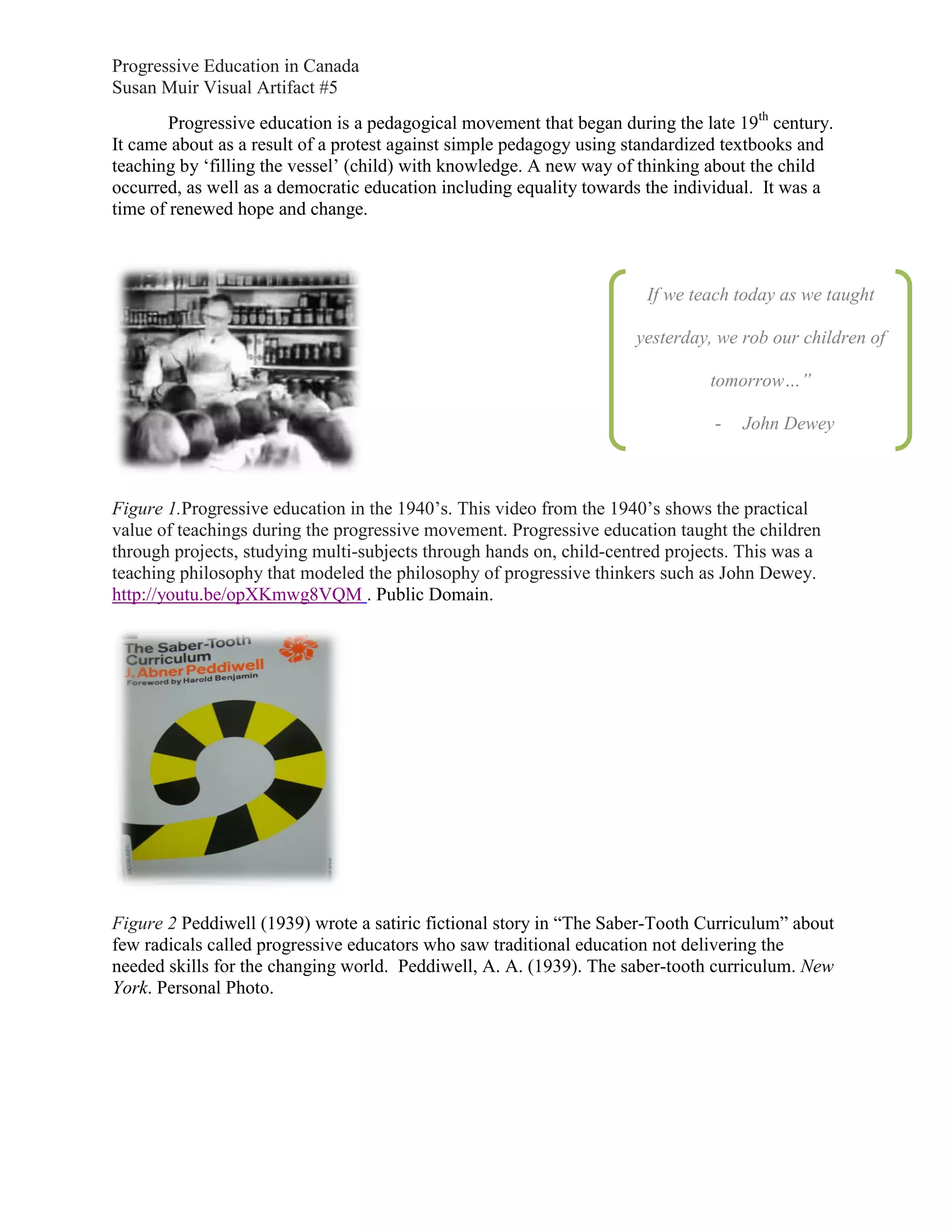 Progressive education began in the late 19th century as a protest against standardized textbooks and rote learning methods. It advocated for a more child-centered approach where students could discuss ideas and work on hands-on projects tailored to their interests. Progressive teachers acted as facilitators rather than authorities, emphasizing democratic and cooperative learning over strict memorization. This movement spread in Canada in the early-to-mid 20th century and aimed to make education more relevant to the needs of students and the workforce through experiential learning opportunities.
