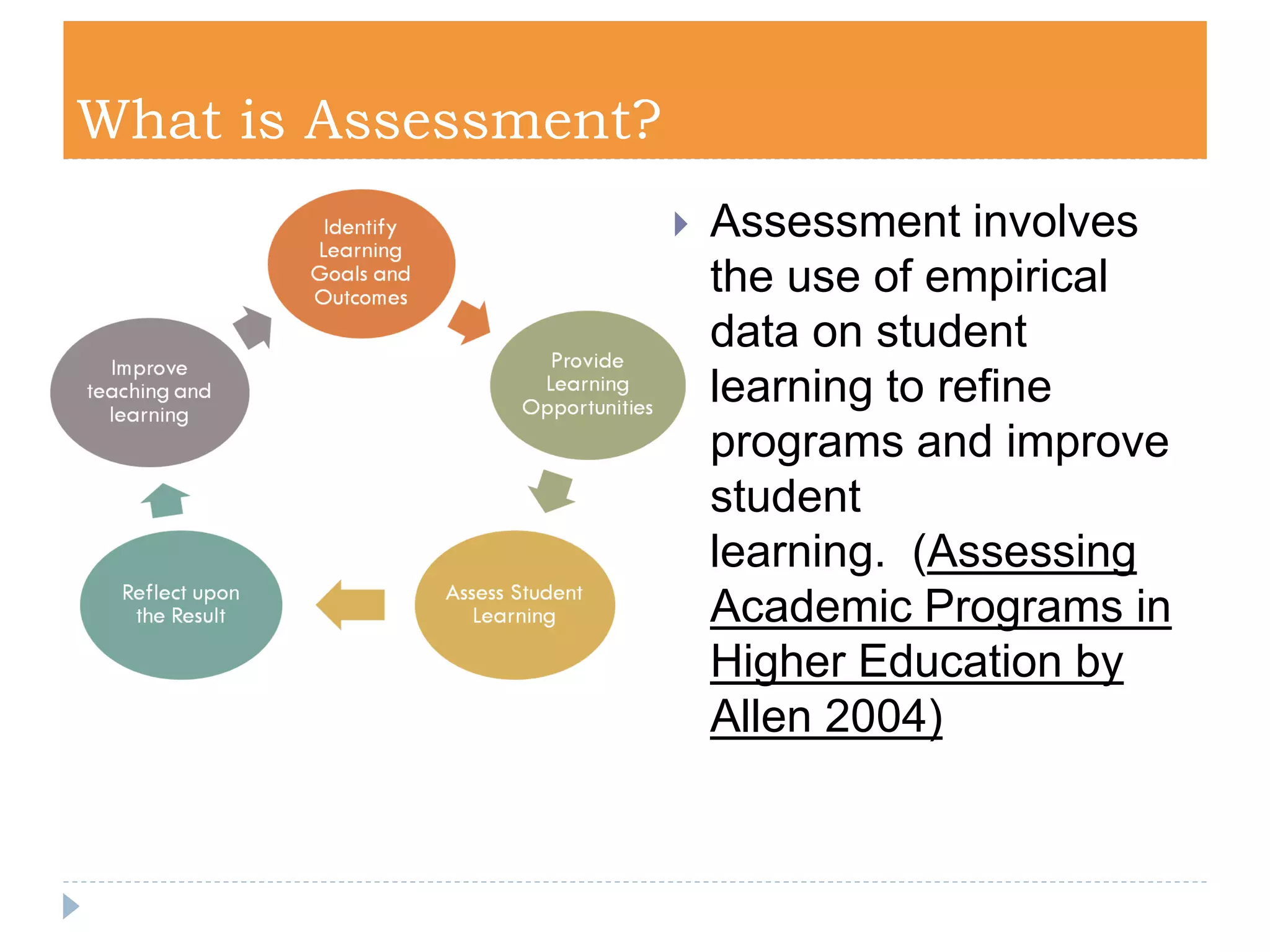 This document outlines Westchester Community College's process for assessing and improving its Visual Arts program. It begins by identifying the program's learning goals and outcomes. It then discusses how the curriculum and courses are designed to meet these goals by preparing students with portfolio requirements for transfer. The document describes assessing student learning through portfolio reviews and using the results to reflect on successes, challenges, and ways to strengthen the program, such as improving advisement and establishing skill benchmarks. Finally, it addresses upcoming changes like new degree requirements that will impact the assessment process.