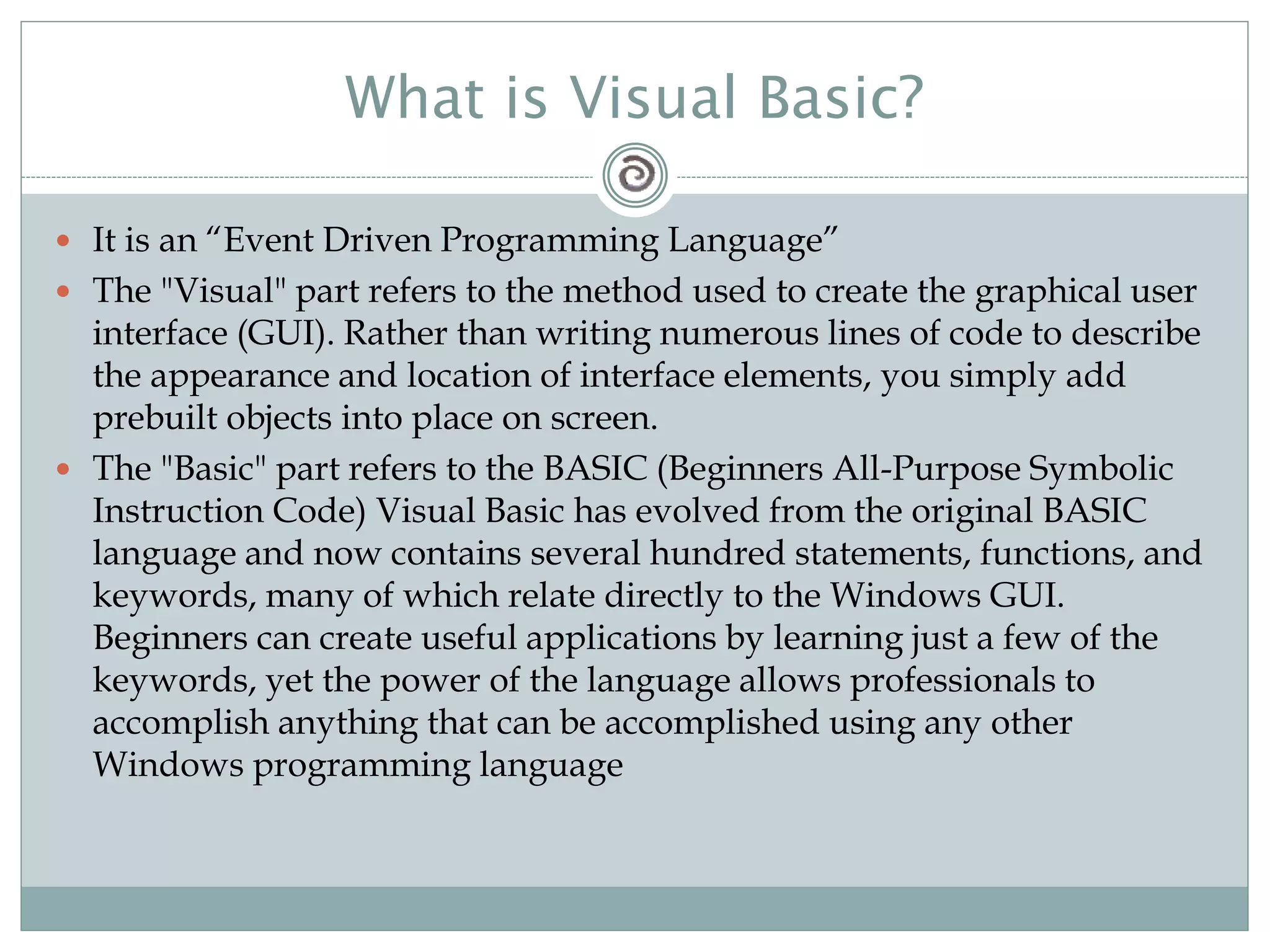 The document provides an overview of Visual Basic 6 and its key concepts. It discusses Visual Basic as an event-driven programming language used to build graphical user interfaces. It explains some of Visual Basic's main features like data access, ActiveX technologies, and internet capabilities. It also covers important Visual Basic concepts like windows, events, event-driven programming, interpreting and compiling code, and the Visual Basic integrated development environment.