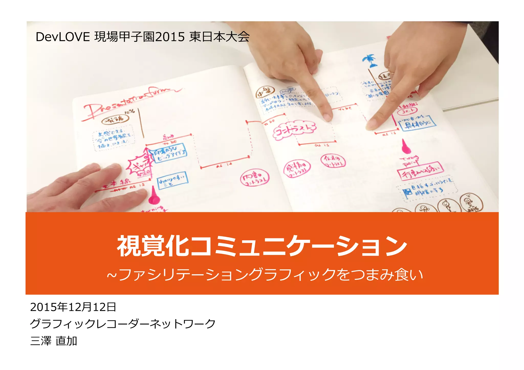 Devlove 現場甲子園 2015 東日本大会で行った講演&ワークショップ資料です。絵が苦手な人でもチャレンジできるファシリテーション・グラフィックのポイントが体験できるワークショップを実施しました。