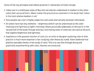 The document explores the concept of language, particularly visual language, and its impact on perception through typography, color, and shape. It discusses the responsibilities of typographers and the effects of simultaneous contrast in color interactions. Additionally, it touches on semiotics and the significance of signs and symbols in visual communication.