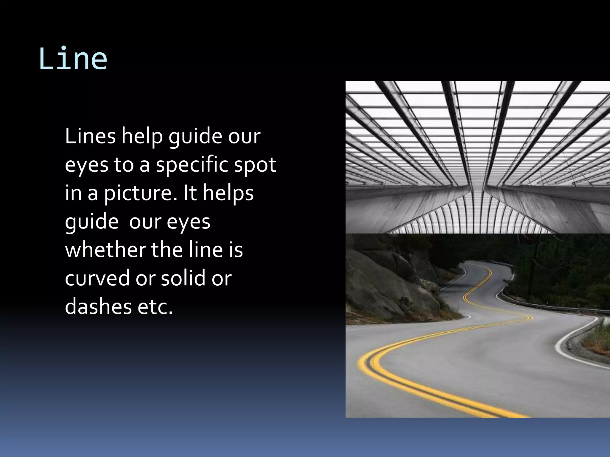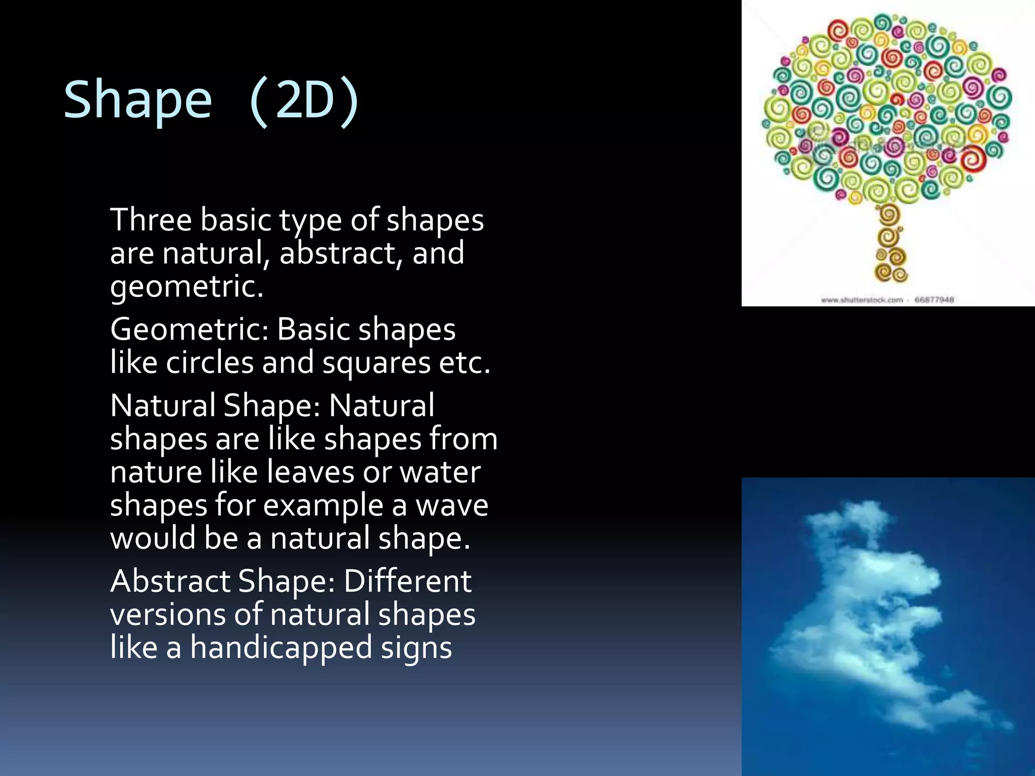 Lines help guide the eye to specific areas of an image. There are three basic types of 2D shapes: geometric, like circles and squares; natural shapes found in nature; and abstract shapes which are modified versions of natural shapes. Form refers to 3D shapes that have volume and can contain solids, liquids or gases. Color, texture, depth, light, direction, mass, tone, value, space, balance, emphasis, proportion, repetition, unity, contrast, harmony, proximity, and variety are all design elements that can be manipulated to achieve different artistic effects in an image.