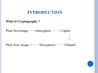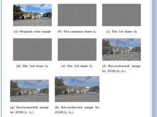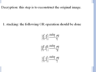 This document provides an overview of visual cryptography, including its introduction, types, implementation methods, advantages, disadvantages, and applications. Visual cryptography allows visual information like pictures and text to be encrypted in a way that can be decrypted by the human visual system. It was pioneered in 1994 and works by splitting an image into shares such that stacking a sufficient number of shares reveals the original image. The document discusses various visual cryptography schemes and their properties.