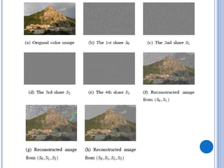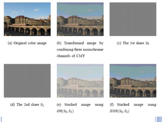 This document provides an overview of visual cryptography, including its introduction, types, implementation methods, advantages, disadvantages, and applications. Visual cryptography allows visual information like pictures and text to be encrypted in a way that can be decrypted by the human visual system. It was pioneered in 1994 and works by splitting an image into shares such that stacking a sufficient number of shares reveals the original image. The document discusses various visual cryptography schemes and their properties.