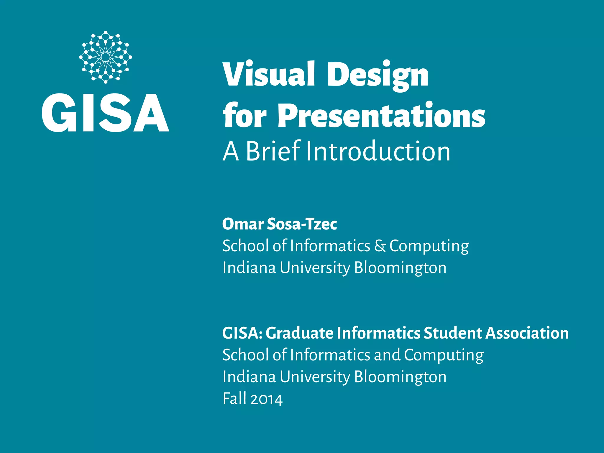 A quick introduction to visual design for presentations. Slides of Friday GISA's talk-- Graduate Informatics Student Association. School of Informatics and Computing. Indiana University Bloomington.