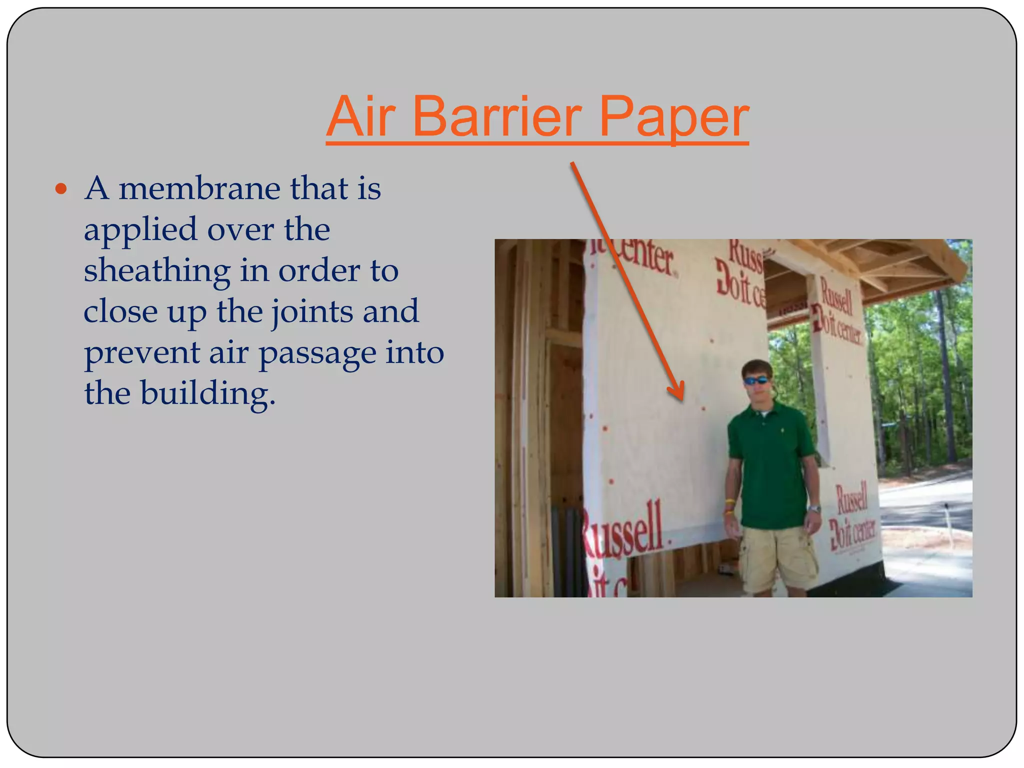 This document provides definitions and descriptions of various construction terms and materials. It discusses components of building framing, roofing, masonry, plumbing, electrical systems, windows, doors, insulation, vapor barriers, and other elements. Definitions include air barriers, batt insulation, brick bonds, cladding types, concrete joints, framing elements, gypsum board, mortar types, rebar, roof drainage components, siding, steep roof materials, stone types, vapor retarders, waterproofing, weep holes, and welded wire fabric. Dimensions and purposes are provided for many items.