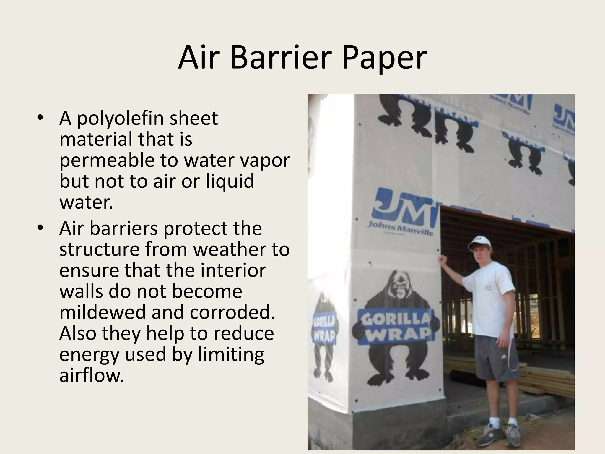 This document provides definitions and descriptions of various construction materials and building components. It includes explanations of air barriers, attic ventilation components like soffit vents and ridge vents, excavation equipment like backhoes and front end loaders, foundation components like batter boards, types of brick bonds and brick sizes, concrete joints, concrete masonry units, doors and windows, electrical system parts, framing elements, insulation materials, masonry units, plumbing fixtures, roofing materials and components, siding materials, steel components, and more.