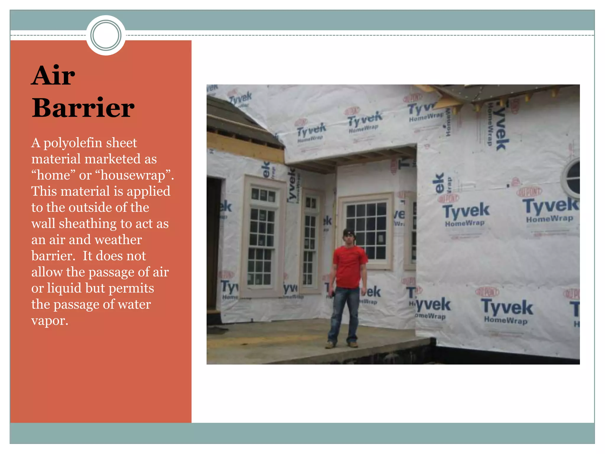 This document provides definitions and descriptions of various construction terms. It includes explanations of materials and components used in building structures like houses. Some terms that are defined include air barrier, attic ventilation, backhoe, batter boards, brick bonds, brick sizes, bulldozer, cladding types, concrete joints, doors, electrical components, framing elements, gypsum board, heat pumps, insulation types, joints in masonry, lintel, mortar, oriented strand board, plumbing components, plywood manufacturing process, radiant barrier, rebar, roof drainage, roofing underlayment, roof shapes, siding materials, stone patterns, vapor retarder, waterproofing, weep holes, welded wire