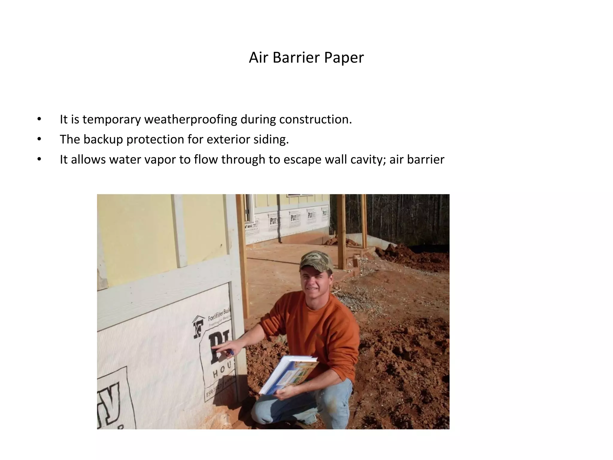 - Air barriers which provide backup protection for exterior siding and allow water vapor to escape wall cavities.