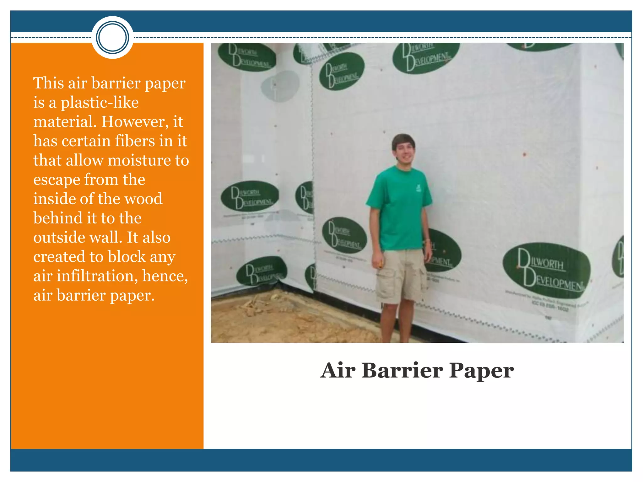 The document provides definitions and descriptions of various construction terms and materials. It includes explanations of air barrier paper, attic ventilation types, backhoes, batter boards, brick bonds and sizes, bulldozers, cladding types, code requirements, concrete joints and masonry units, decorative concrete blocks, door parts, electrical components, framing elements, front end loaders, gypsum board, heat pumps, insulation types, lintels, mortar, oriented strand board, plumbing components, plywood, radiant barriers, rebar, roof drainage, roof materials and shapes, stone types, steep roof terms, vapor retarders, waterproofing, weep holes, welded wire fabric, and window types.