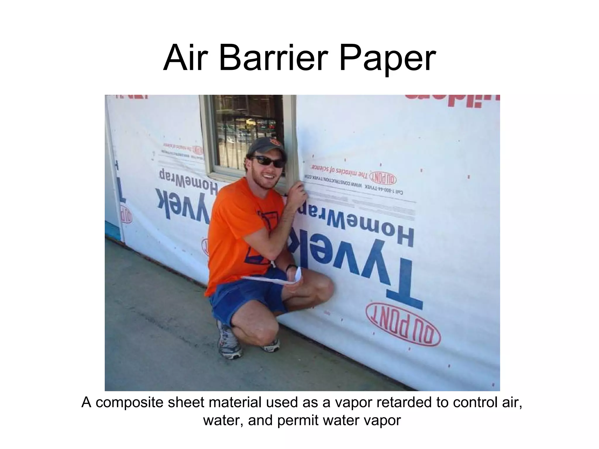 1. The document defines and describes various construction materials and components used in building construction including air barriers, attic ventilation, backhoes, brick bonds, brick sizes, cladding materials, doors, electrical components, framing elements, insulation types, lintel, mortar joints, oriented strand board, plumbing fixtures, plywood, rebar, roofing materials and components, siding, stone types, vapor retarders, waterproofing, weep holes, welded wire fabric, and window types.