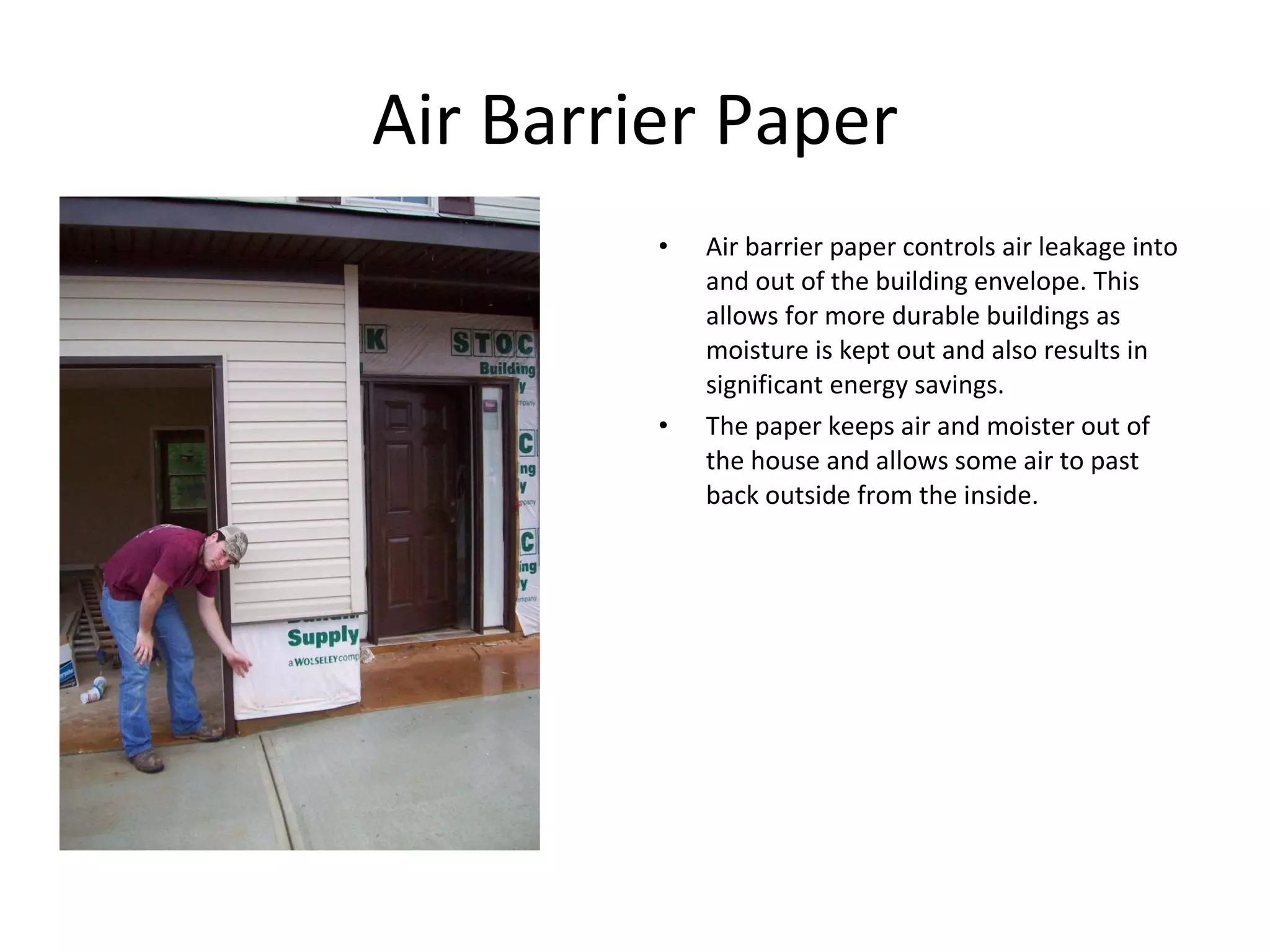 The document provides definitions and descriptions of various construction and building terms. It explains concepts like air barrier paper, attic ventilation components, backhoes, batter boards, brick bonds and sizes, bulldozers, cladding materials, concrete joints, concrete masonry units, decorative concrete units, doors and door components, electrical components, framing components, front end loaders, gypsum board, heat pumps, insulation types, lintels, mortar joints, oriented strand board, plumbing components, plywood, radiant barriers, rebar, roof drainage components, roof materials and shapes, stone styles, vapor retarders, waterproofing, welded wire fabric, and window types.