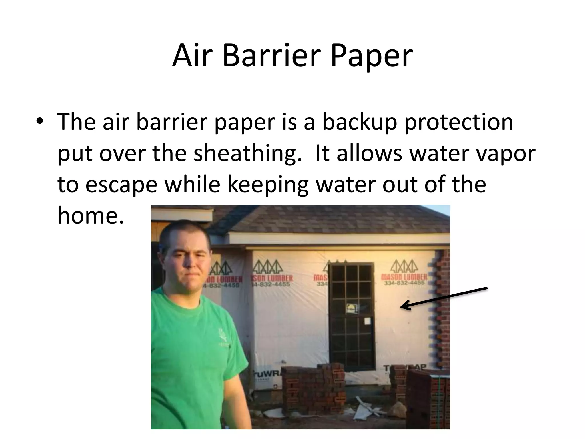 This document defines and describes various building materials and components. It includes definitions of air barrier paper, different types of attic ventilation such as soffit vents and ridge vents, and machinery like backhoes and bulldozers. It also covers framing elements, doors, windows, electrical components, insulation, plumbing fixtures, roofing materials and terms, masonry units, and other construction topics. Each entry provides a brief description and relevant details about the item.