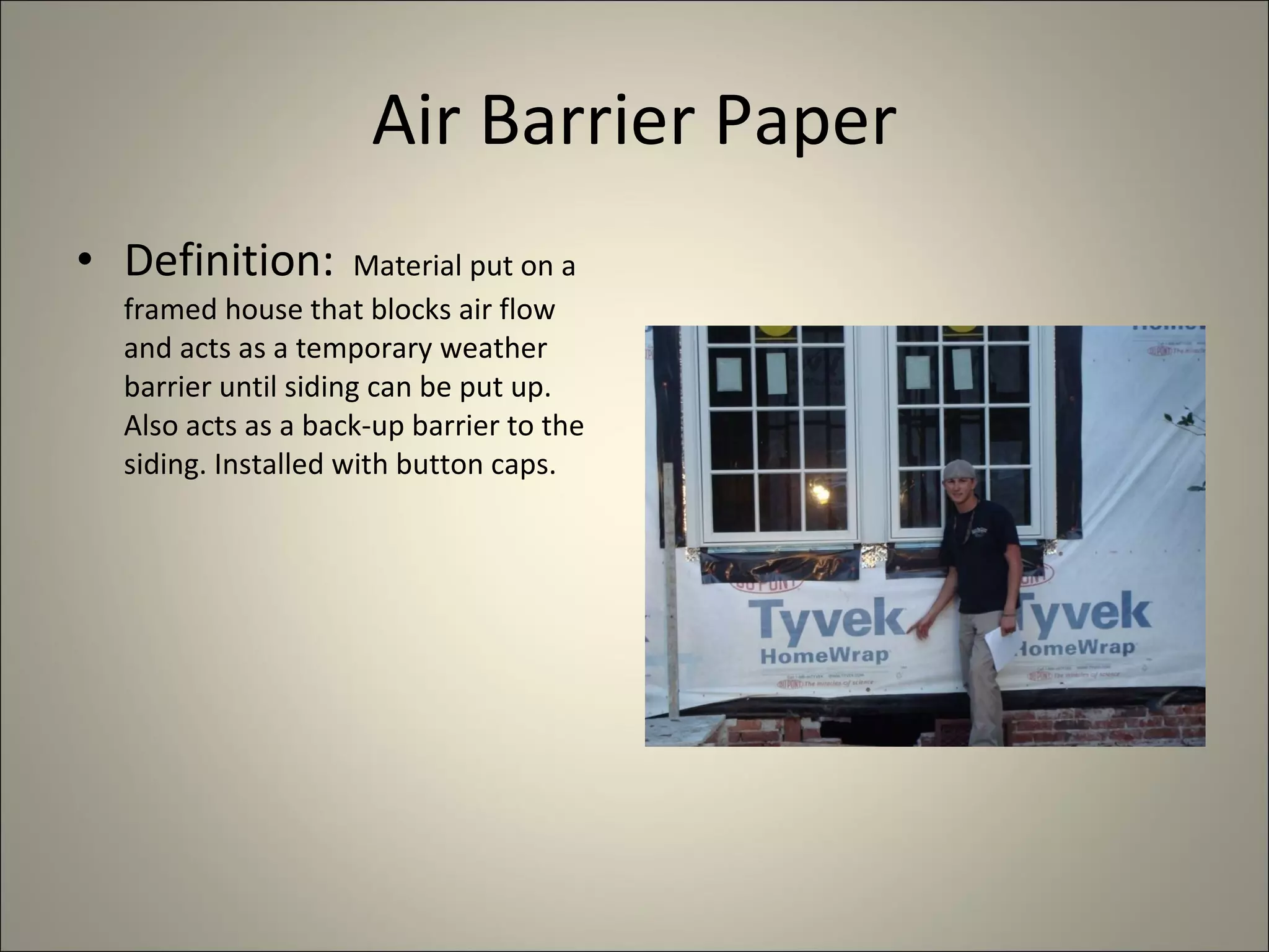 This document defines and describes various construction materials and components. It provides definitions and descriptions of items like air barrier paper, attic ventilation materials, backhoes, batter boards, brick bonds, concrete joints, framing elements, insulation materials, mortar joints, rebar, roof drainage components, siding materials, vapor retarders, waterproofing, windows, and more - with accompanying diagrams and photos. The document acts as a visual dictionary to concisely define and illustrate essential construction terms and products.