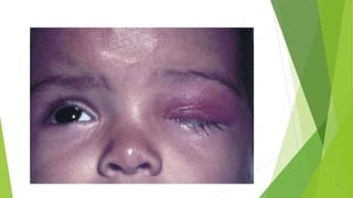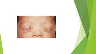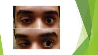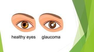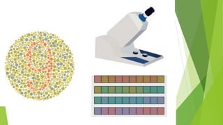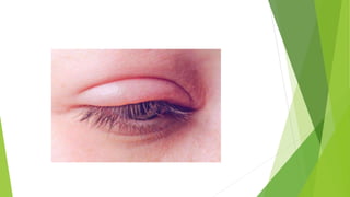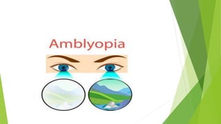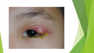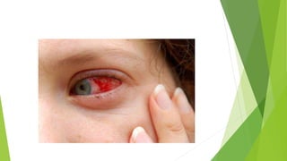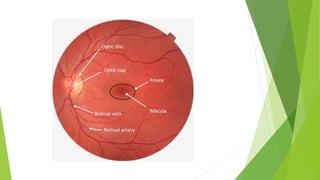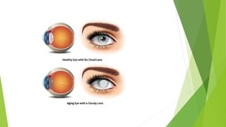 This document provides an overview of visual disorders including the anatomy and physiology of the eye. It discusses several common inflammatory and non-inflammatory conditions that can cause visual impairment such as conjunctivitis, ophthalmia neonatorum, retinitis, stye, cataract, glaucoma, and ptosis. It also covers refractive errors including myopia, hyperopia, and astigmatism. Disorders that can impair vision like strabismus, amblyopia, color blindness, diplopia, and night blindness are described. For each condition, the definition, causes, pathophysiology, clinical manifestations, diagnostic evaluation, management and prevention are summarized.