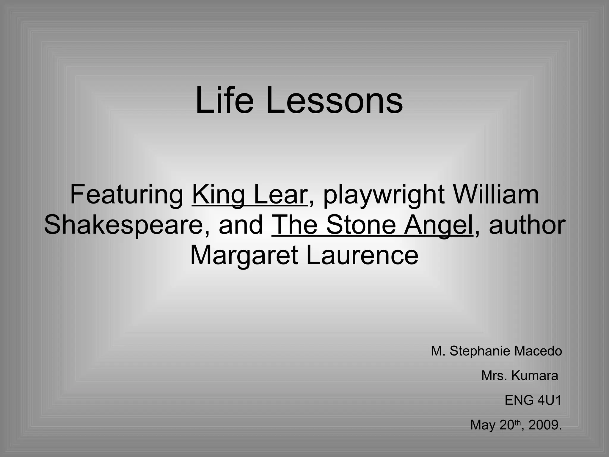 This document provides a summary of lessons learned from William Shakespeare's play King Lear and Margaret Laurence's novel The Stone Angel. Some of the key lessons mentioned are the importance of patience, forgiveness, and unconditional family love. It also discusses letting oneself grow and learn from life's experiences. The document references several quotes from the two works and includes a works cited page with links to relevant images.