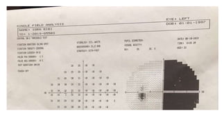 This document provides an overview of visual field basics and interpretation. It defines key terms like visual field, isopter, scotoma and perimetry. It describes the normal limits and locations of visual field defects. Different visual field testing methods are outlined, including manual Goldmann perimetry and automated static perimetry tools like Humphrey and Octopus. Factors affecting visual field tests and how to interpret results, including global indices, are also summarized.
