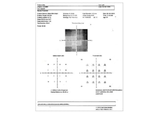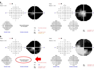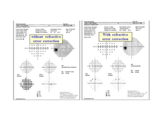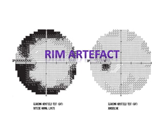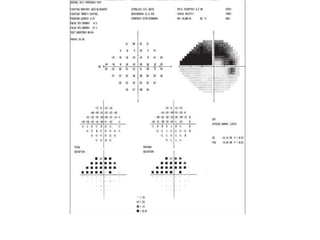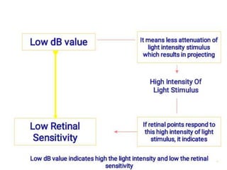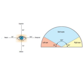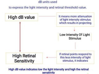 This document discusses the visual field and visual field testing. It defines the visual field as the part of the environment that can be detected by a steady eye. It then discusses the physiological basis of the visual field and factors that can affect visual field testing results, such as stimulus characteristics and patient factors. The document also summarizes different types of visual field defects and explains common perimetry techniques and their advantages. It provides details on visual field test interpretation, including reliability indices, total and pattern deviation plots, and classification of results.