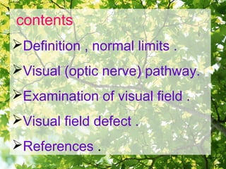 This document defines the visual field and describes how it is examined. The visual field refers to the area that can be seen and has normal limits of 60 degrees superiorly, 60 degrees nasally, 75 degrees inferiorly, and 100 degrees temporally. The visual pathway involves the optic nerves transmitting signals from the retina to the brain. Visual field examinations assess central and peripheral vision using techniques like confrontation testing, Amsler grids, and perimetry. Common visual field defects include scotomas and hemianopias, which can be caused by conditions like glaucoma and optic neuropathies.