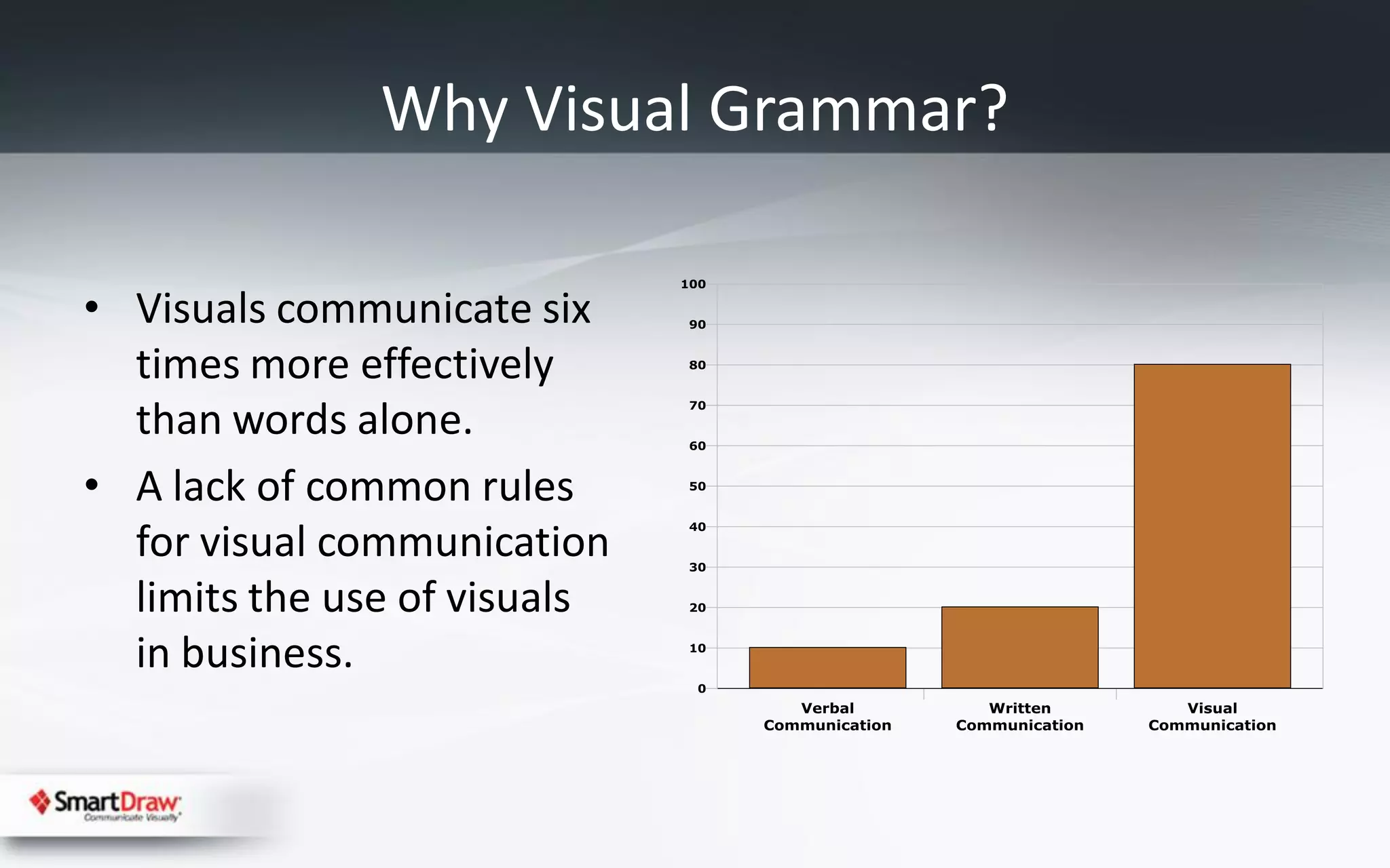 The document discusses the importance of visual grammar in business communication, emphasizing that visuals can communicate more effectively than text. It outlines rules for creating effective visuals, including consistency and one-page rules, as well as specific guidelines for flowcharts, organization charts, and mind maps. Additionally, it mentions the SmartDraw tool, which applies these visual grammar rules automatically.