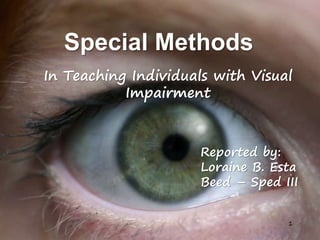 This document discusses special methods for teaching individuals with visual impairments. It begins by defining visual impairment and classifying types, including totally blind, low vision, and classifications based on age of onset such as congenitally blind. Various eye conditions that cause visual impairments are described, along with characteristics of visually impaired children. Common tests used to measure visual acuity are explained. Different program models for educating visually impaired students are outlined, and special equipment and materials like Braille writers and tactile aids are covered. The roles of professionals who provide support services are defined. Finally, key special teaching methods are emphasized, such as individualization, use of concrete objects, multisensory instruction, additional stimulation, and self-activity