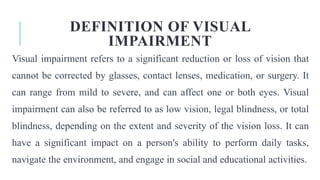 The document discusses visual impairment, defining it as a significant loss of vision not correctable by standard means, and highlights various types such as low vision, blindness, and total blindness along with their causes, effects, coping strategies, and legal rights. It outlines the psychological, physical, and social impacts of visual impairment and emphasizes the importance of supportive strategies like assistive technology and advocacy for individuals affected. Additionally, the document provides guidelines for effective communication with visually impaired individuals.