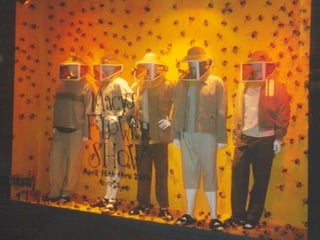 This document discusses visual merchandising and display techniques for retail stores. It covers store layouts like grid and maze formats. Fixtures include carousels, dump bins, racks and waterfalls for merchandise presentation. Displays should use lighting, props and signage to attract customers. Window displays are the first impression for those outside and come in various formats like enclosed, ramped or elevated windows. Interior displays are located at entrances, ends of aisles and near cash registers.