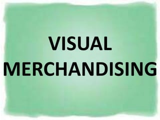 Visual merchandising is the practice of coordinating physical elements in a store to project the right image to customers. This includes elements like storefront, interior design, lighting, signage, and merchandise displays. The goal is to attract customers, engage them in the store environment, and motivate them to make purchases. Effective visual merchandising techniques include using mannequins, fixtures, and props to creatively display merchandise in a way that tells a story and highlights product features. Regularly changing interior displays is also important to keep the store looking fresh and interesting to customers.