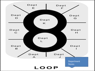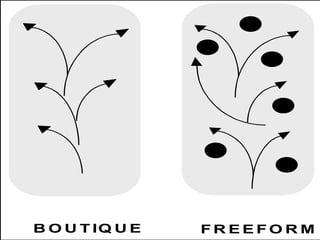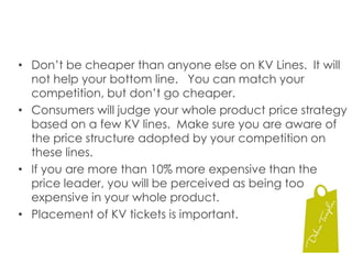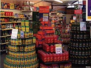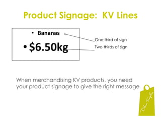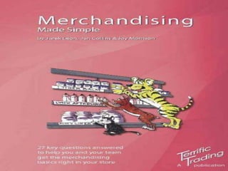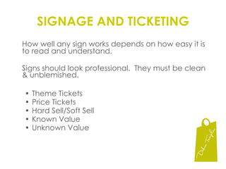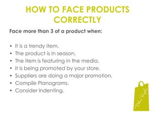 This document provides tips and best practices for visual merchandising and store layout to optimize sales. It discusses the importance of visual merchandising in communicating with customers and supporting sales. Specific recommendations include using signs, displays, fixtures and product placement strategically to guide customer flow and highlight key items. Hot spots and other high-traffic areas should feature impulse buys and promotions. Proper use of color, lighting and other visual elements can attract customers and influence purchasing decisions.