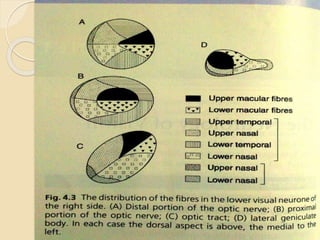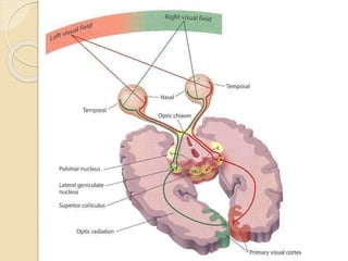The visual pathway conveys visual signals from the retina to the visual cortex. Light is detected by photoreceptors (rods and cones) and converted to electrical signals. These signals pass through bipolar and ganglion cells in the retina and then through the optic nerve, optic chiasm, optic tracts and lateral geniculate body to the visual cortex via the optic radiations. Lesions along this pathway can cause different visual field defects including hemianopia and quadrantic defects depending on the location of the lesion. Common causes of lesions include tumors, vascular abnormalities and infections.
