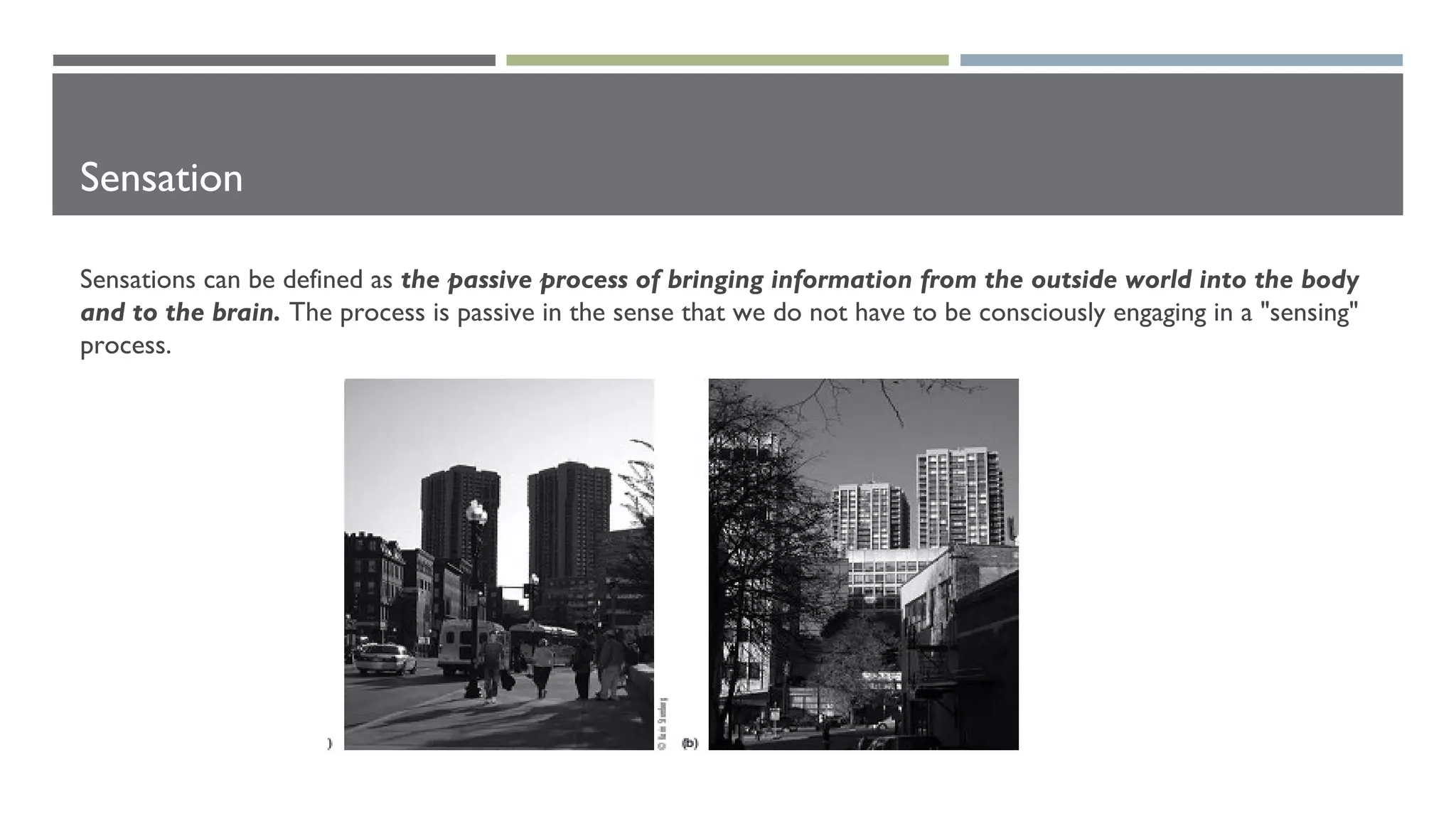 This document discusses visual perception and the processes of sensation and perception. It defines sensation as the passive process of bringing external information to the brain through the senses. Perception is defined as the active process of selecting, organizing, and interpreting sensory information. The document outlines different approaches to perception, including bottom-up stimulus-driven perception, top-down goal-driven perception based on knowledge and expectations, and interactive perception involving both processes. It also discusses theories of bottom-up perception, object perception from viewer-centered and object-centered perspectives, Gestalt laws of patterns and forms perception, and depth perception.