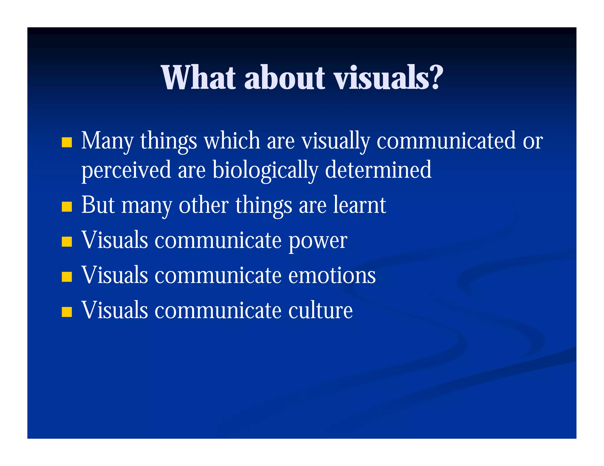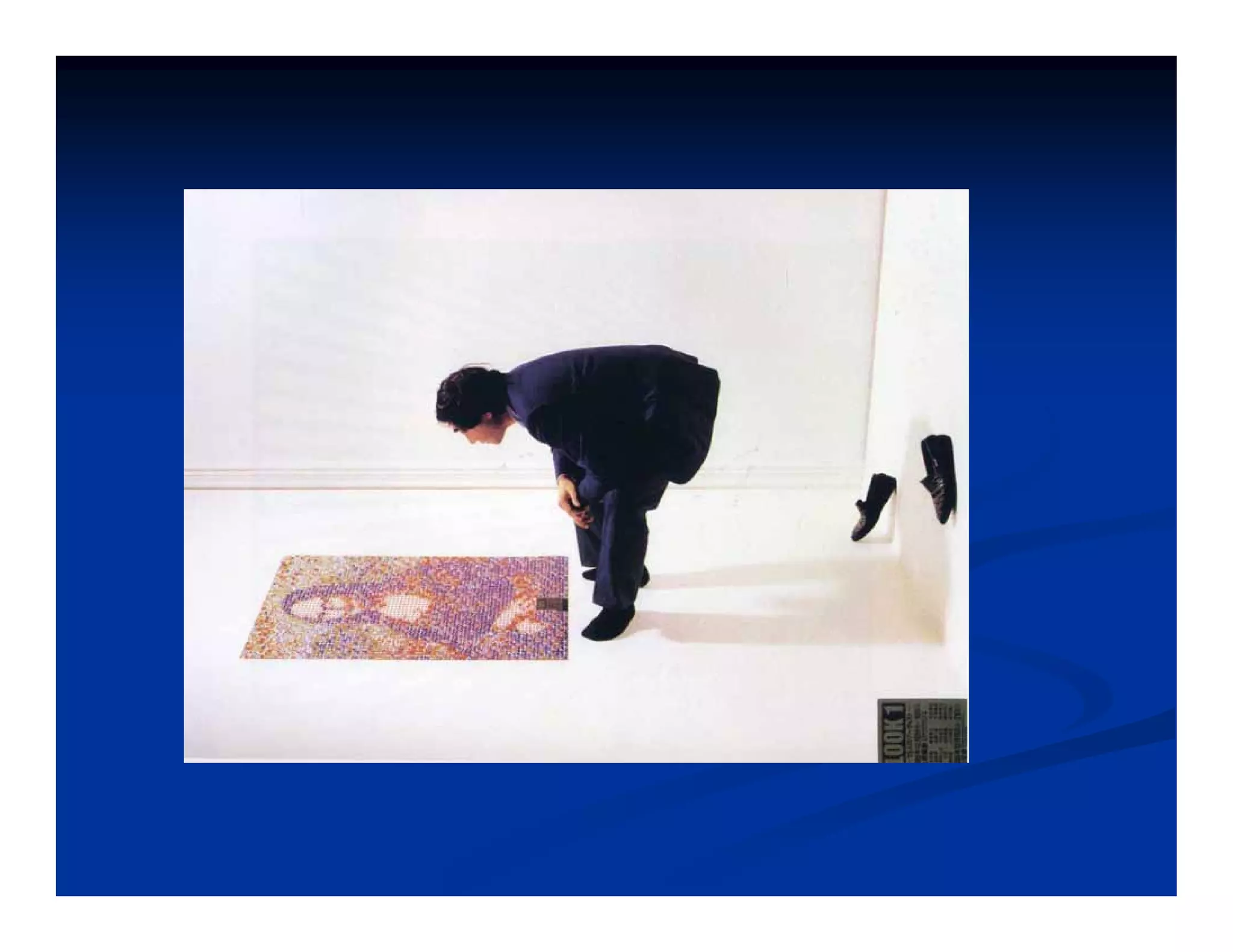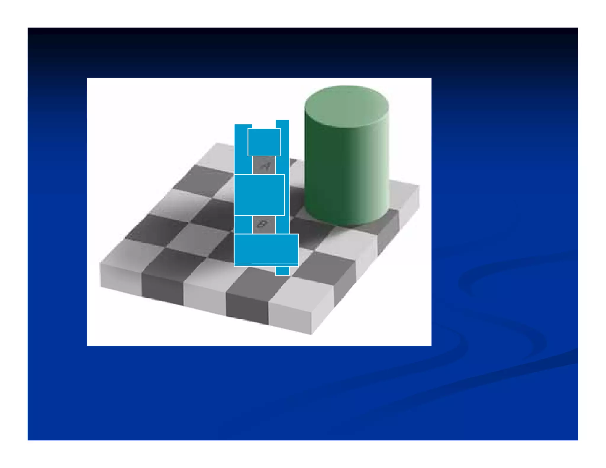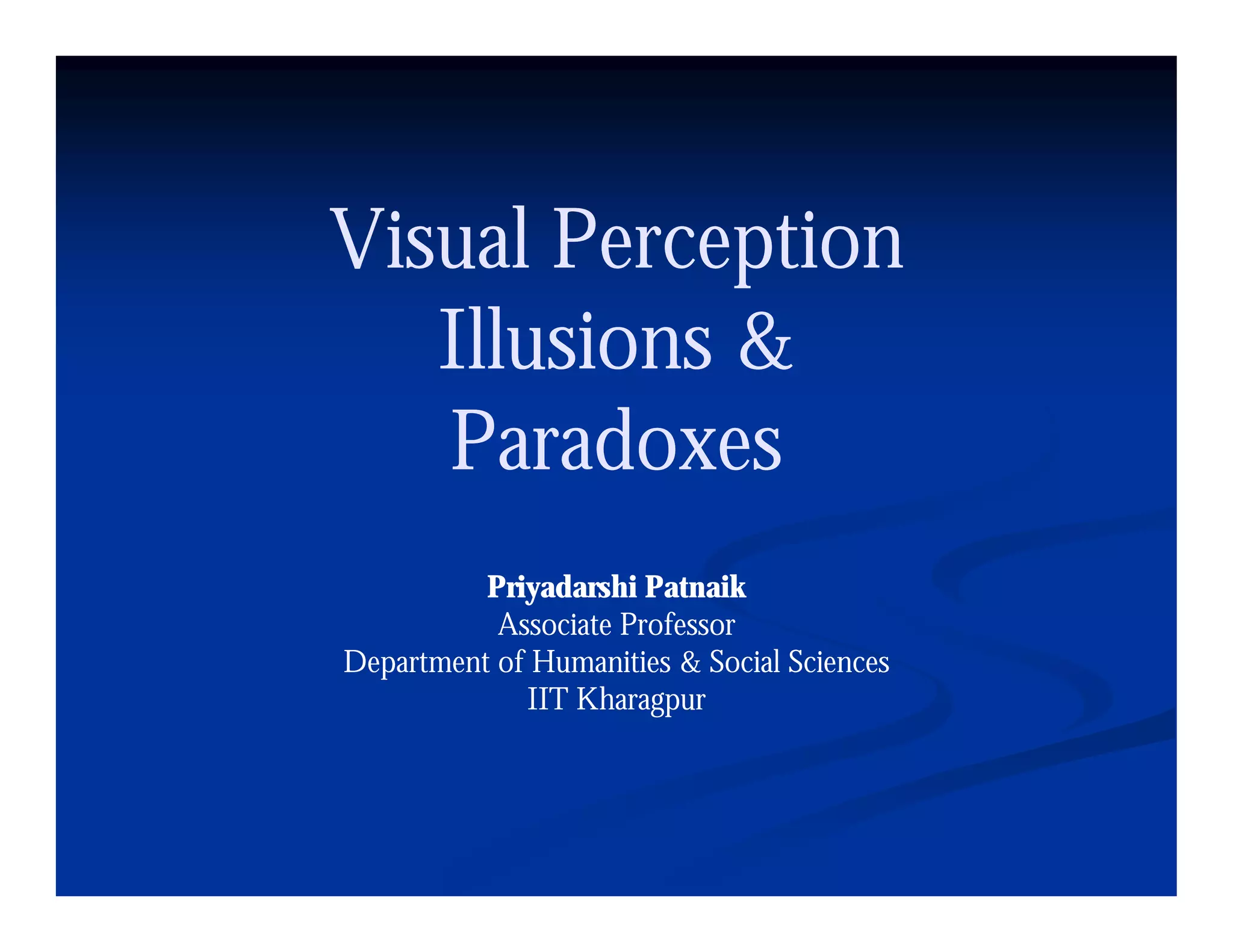 This document discusses visual perception and illusions. It begins by explaining that visual perception involves both biological determinism and learned experiences. It then discusses several concepts related to visual perception, including the Panopticon, emotions communicated through visuals, and how perception involves both sensation and interpretation. The document goes on to explore various visual illusions and paradoxes, how the brain makes inferences to resolve ambiguities, and discusses concepts like attention, filtering, and Gestalt principles of form perception. It analyzes works by several artists and concludes by mentioning references for further information.