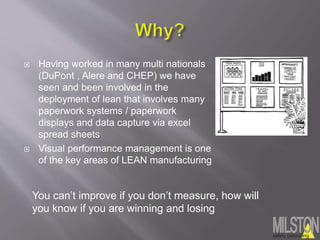 This document describes an innovative low-cost visual performance management software that collects shop floor data quickly and provides feedback on production efficiency. It allows for electronic storage of documents to track key performance indicators and production metrics in real-time on overhead screens. The software is designed to keep implementation costs low and can be accessed via tablets on the factory floor or in boardrooms for live production information and issue highlighting.
