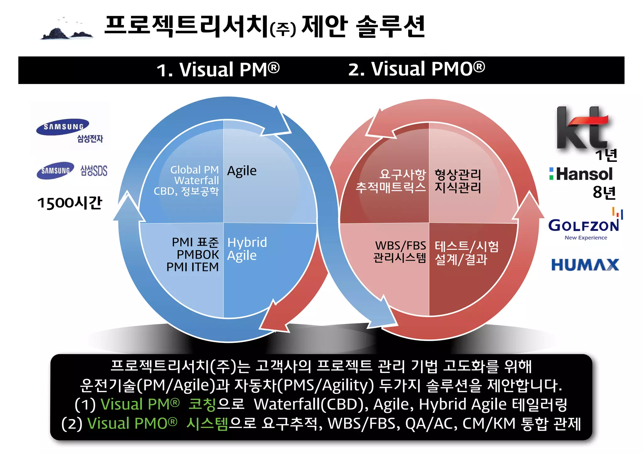 운전기술(PM/Agile)과 자동차(PMS/Agility) 두가지 솔루션을 제안합니다.
