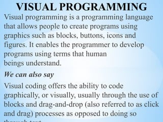 Visual programming allows users to create programs using graphics such as blocks and icons, making coding more accessible. Key features include control blocks, sprites, and a block palette for organizing programs visually. Examples of visual programming platforms include Scratch and Blockly, which utilize reserved words, syntax rules, and control structures to execute instructions.