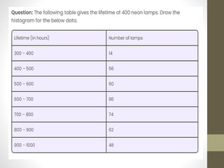 A histogram is a graphical representation of frequency distributions using rectangles, where the width represents class intervals and the height reflects frequency. It consists of five main components: title, x-axis, bars, y-axis, and legend, and is used to summarize large data sets and assist in decision making. Histograms can be categorized into types like uniform, bimodal, symmetric, and probability histograms based on the data distribution.