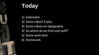 This document outlines a plan for a class on typography and video production. It includes: