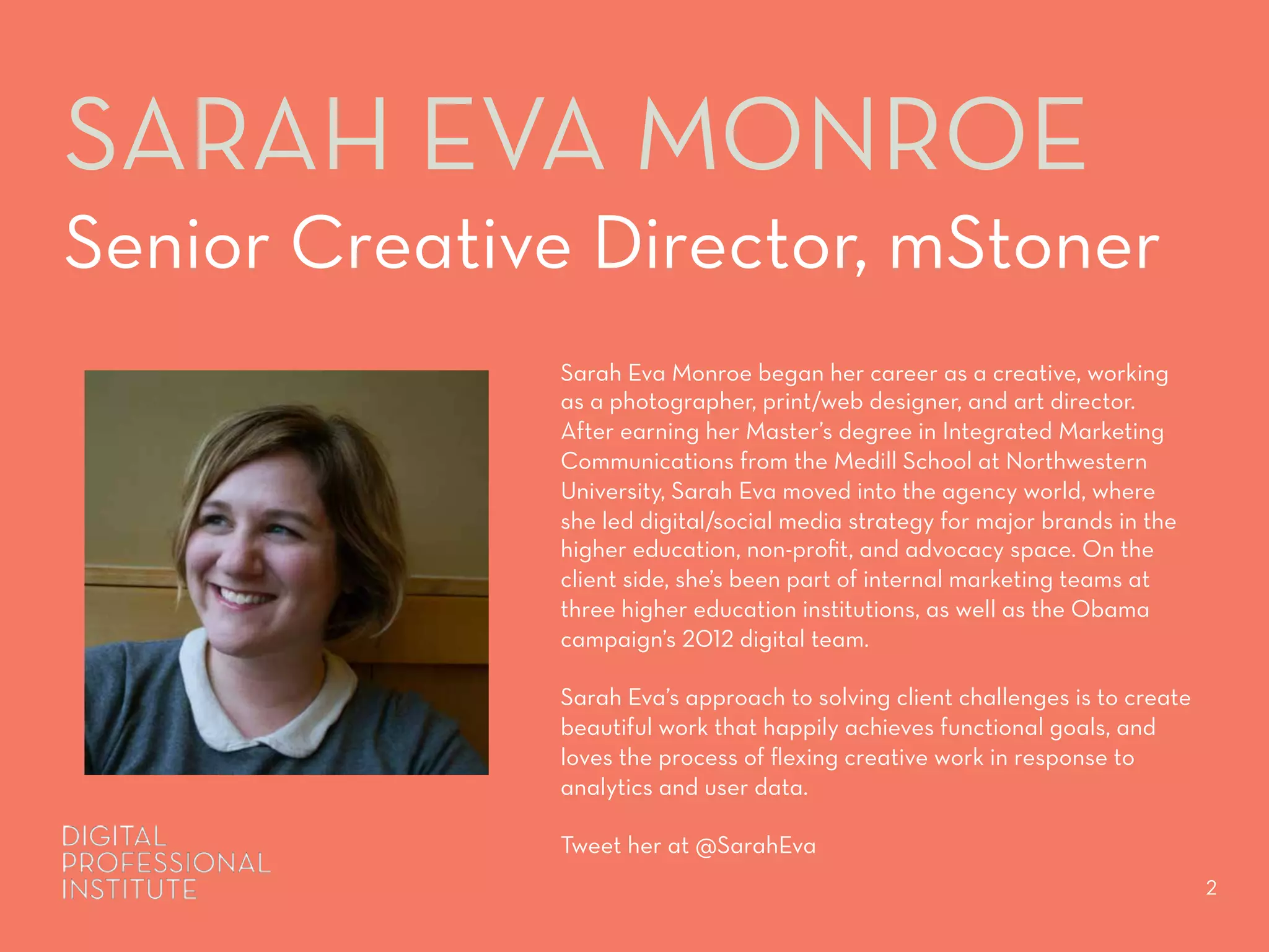 Sarah Eva Monroe, a senior creative director at MStoner, has a diverse background in photography, design, and digital strategy, having worked with major brands and political campaigns. Her document discusses the importance of visual storytelling in social media, emphasizing how images drive engagement and the nuances of selecting effective visuals for branding. Monroe provides insights on story-telling strategies, the impact of visuals in communication, and practical tips for creating compelling imagery.