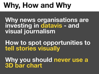 News organizations are increasingly investing in visual journalism and data visualization because it improves engagement with audiences. Visuals like photos and videos perform particularly well on social media in boosting shares. When telling stories about issues like civil rights cases, maps and data visualizations can help illustrate complex topics in a way that resonates more with audiences. As digital media has grown, there are more opportunities to take any type of data or information and present it visually through tools like infographics, charts, and timelines. The rise of visual storytelling across news and online media has led journalists to find new ways to activate audiences and illustrate stories through visual methods.