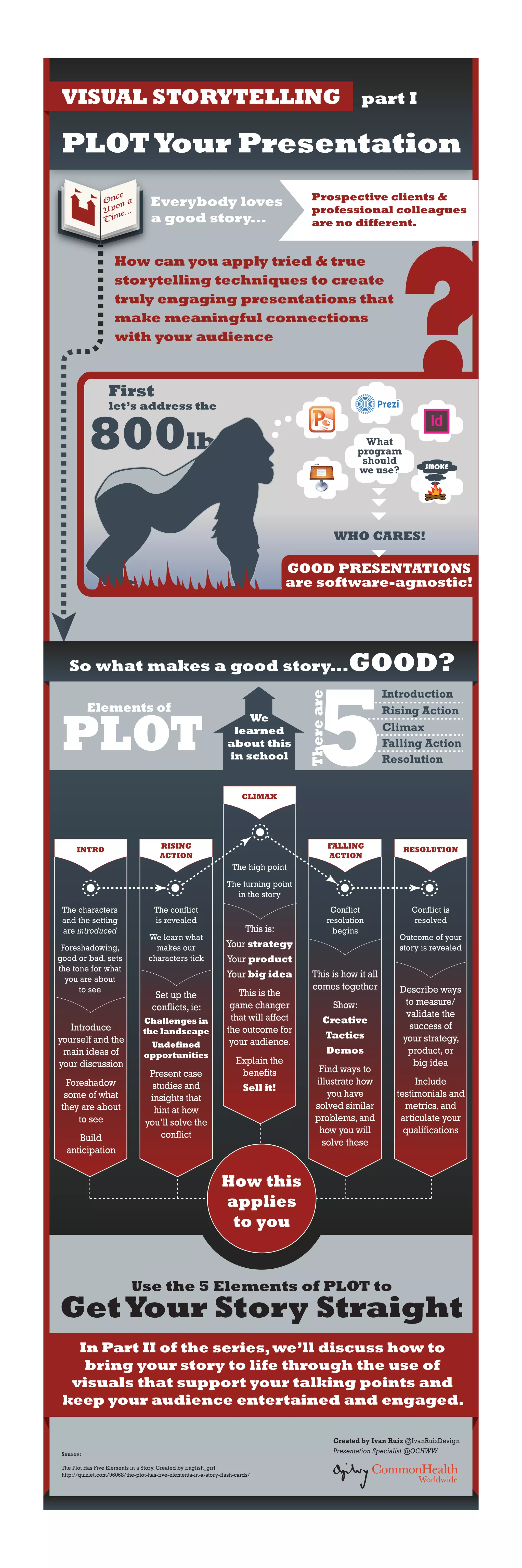 The document discusses how to craft engaging presentations using storytelling techniques, emphasizing the importance of plot elements like introduction, rising action, climax, falling action, and resolution. It suggests that effective storytelling can create meaningful connections with the audience, regardless of the presentation software used. Future content will focus on enhancing presentations with supportive visuals.