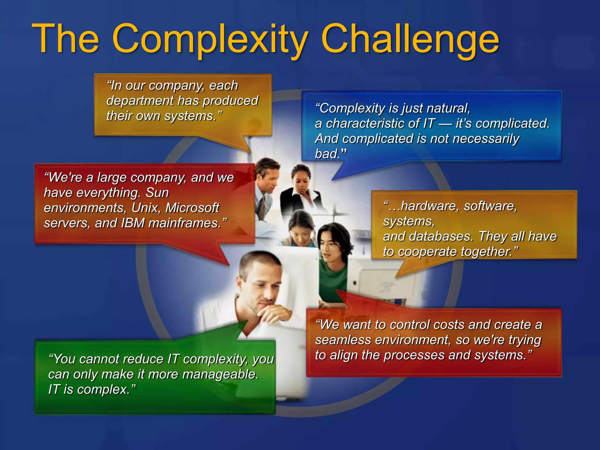 This document discusses managing complexity in IT systems and how Visual Studio 2008 aims to help with this. It notes that companies have many different systems from various vendors that must work together, making IT inherently complex. Visual Studio 2008 seeks to improve developer productivity, enable better collaboration across the lifecycle, and employ the latest technologies to help manage this complexity and make it more controllable. It provides features like LINQ, support for service-oriented architecture, and enhanced testing, deployment, and collaboration tools to help with these goals.