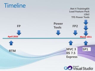This document summarizes the new features and improvements in Visual Studio 2010 SP1, including improved debugging capabilities, support for new technologies like Silverlight 4 and HTML5, and tools to improve developer productivity. It also outlines upcoming pre-release technologies like Visual Studio LightSwitch Beta 2 and ASP.NET MVC 3. A timeline is provided showing the release dates of Visual Studio 2010 RTM, SP1, and related feature packs.