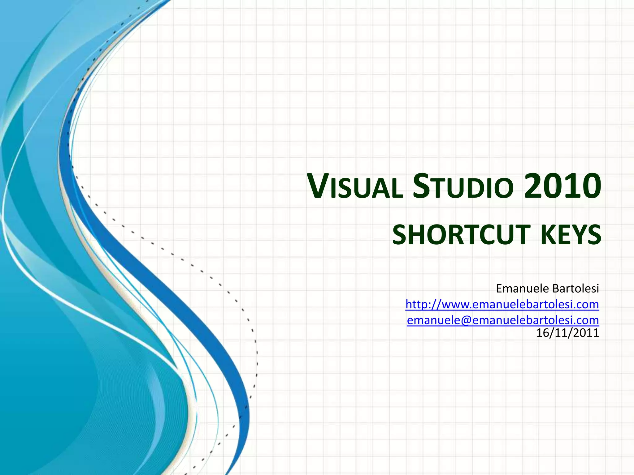 This document provides a list of shortcut keys for Visual Studio 2010 organized by command categories such as Designers and Editors, File and Project, Windows, Debug, and References. It lists the keyboard shortcut for each command and a brief description. For example, CTRL+C or CTRL+INSERT copies selected items, CTRL+S saves selected items in the current project, and F5 starts debugging by running the application until the next breakpoint. The document recommends visiting a Microsoft URL for the full list of Visual Studio shortcut keys.