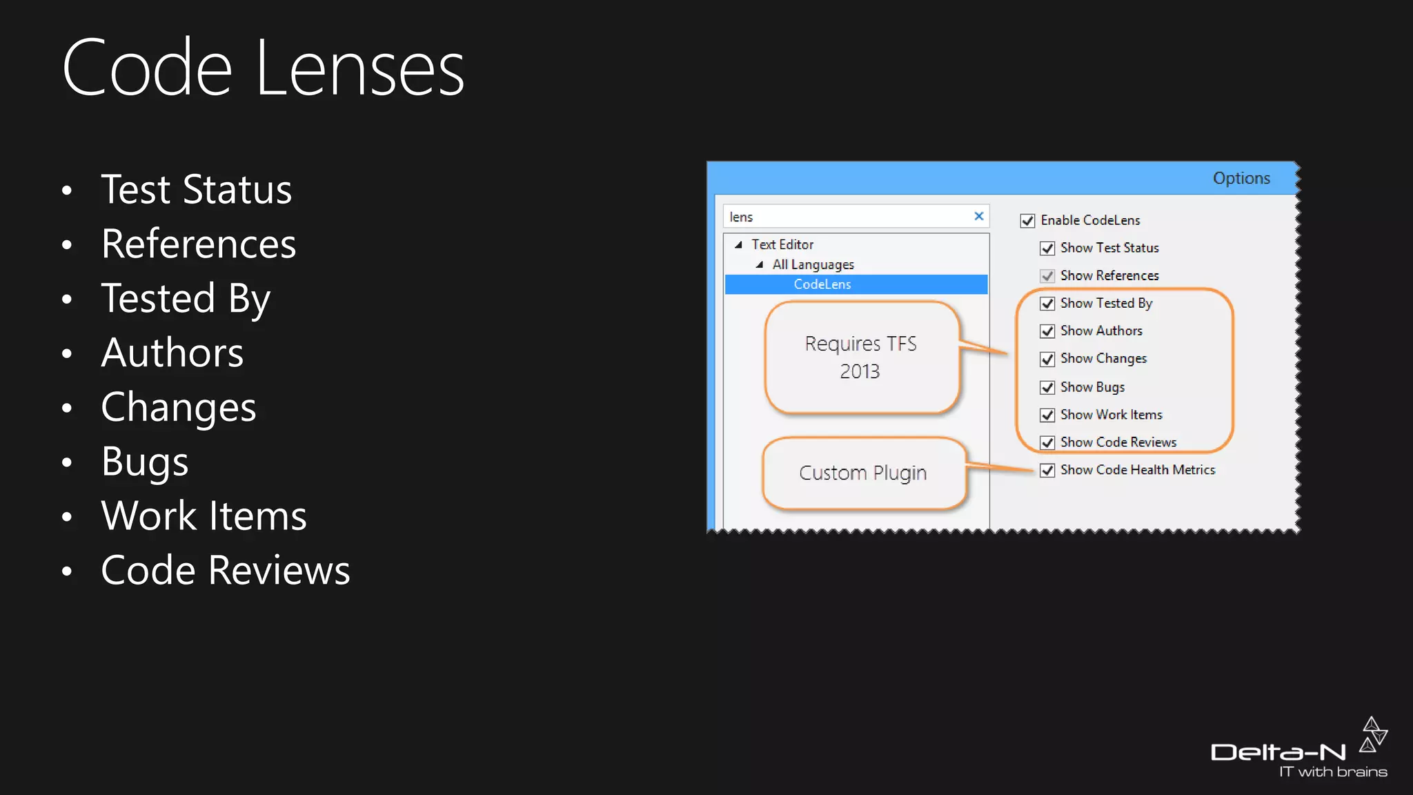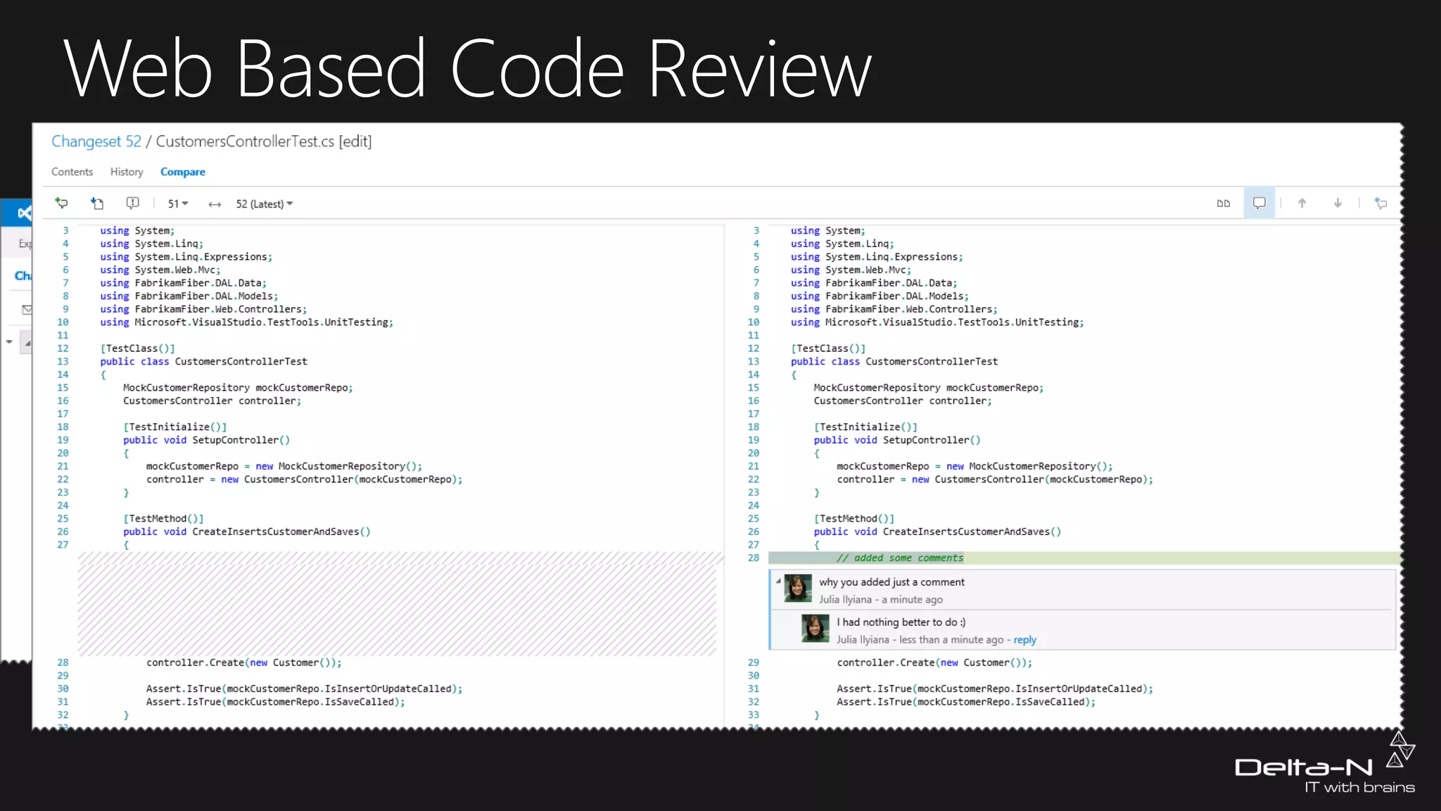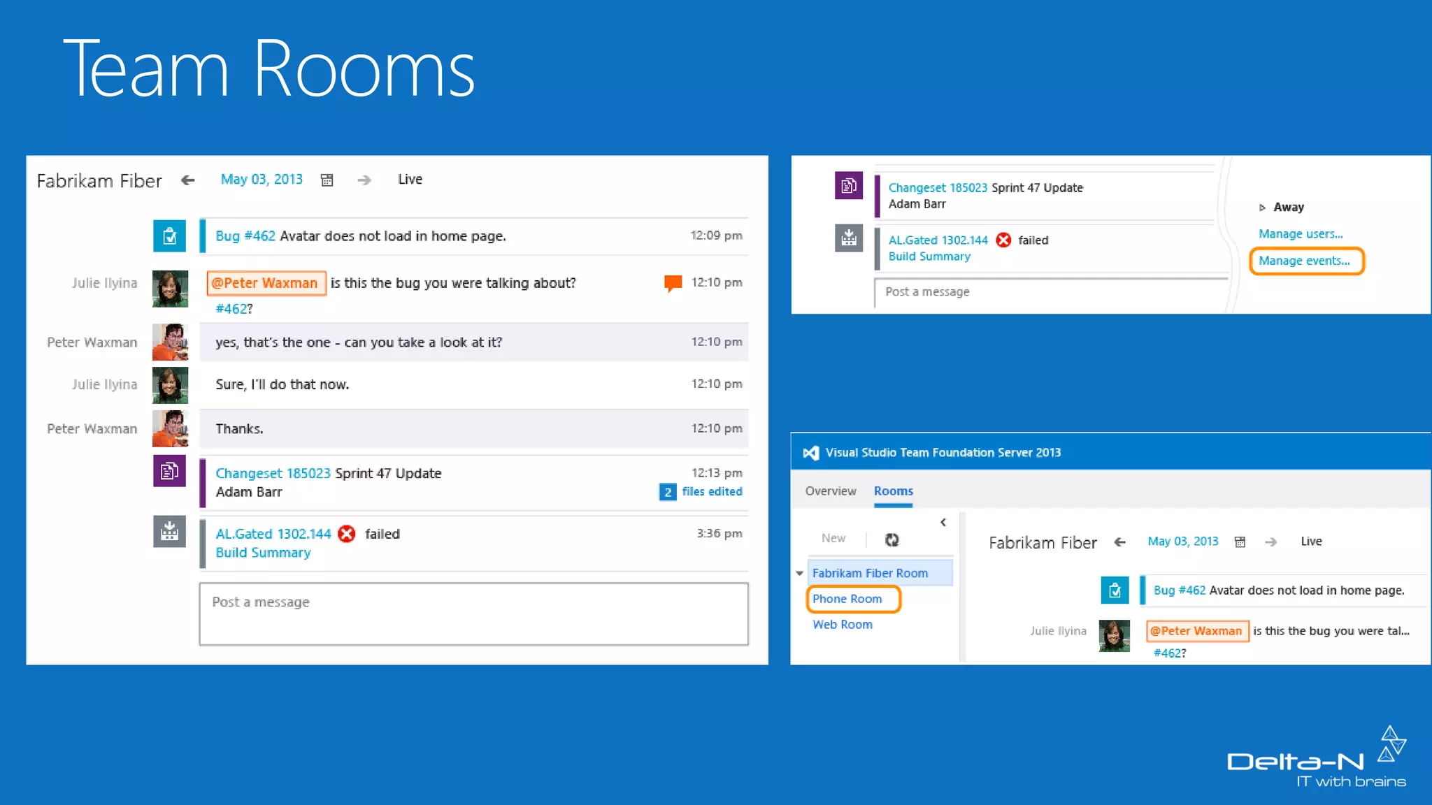The document outlines the services offered by Delta-N, including agile portfolio management, Kanban customization, and integrated release management. It highlights various tools and techniques for software development such as .NET memory dump analysis and version control using TFS 2013 and Git. Additionally, it provides contact information and links to the company's social media and blogs.