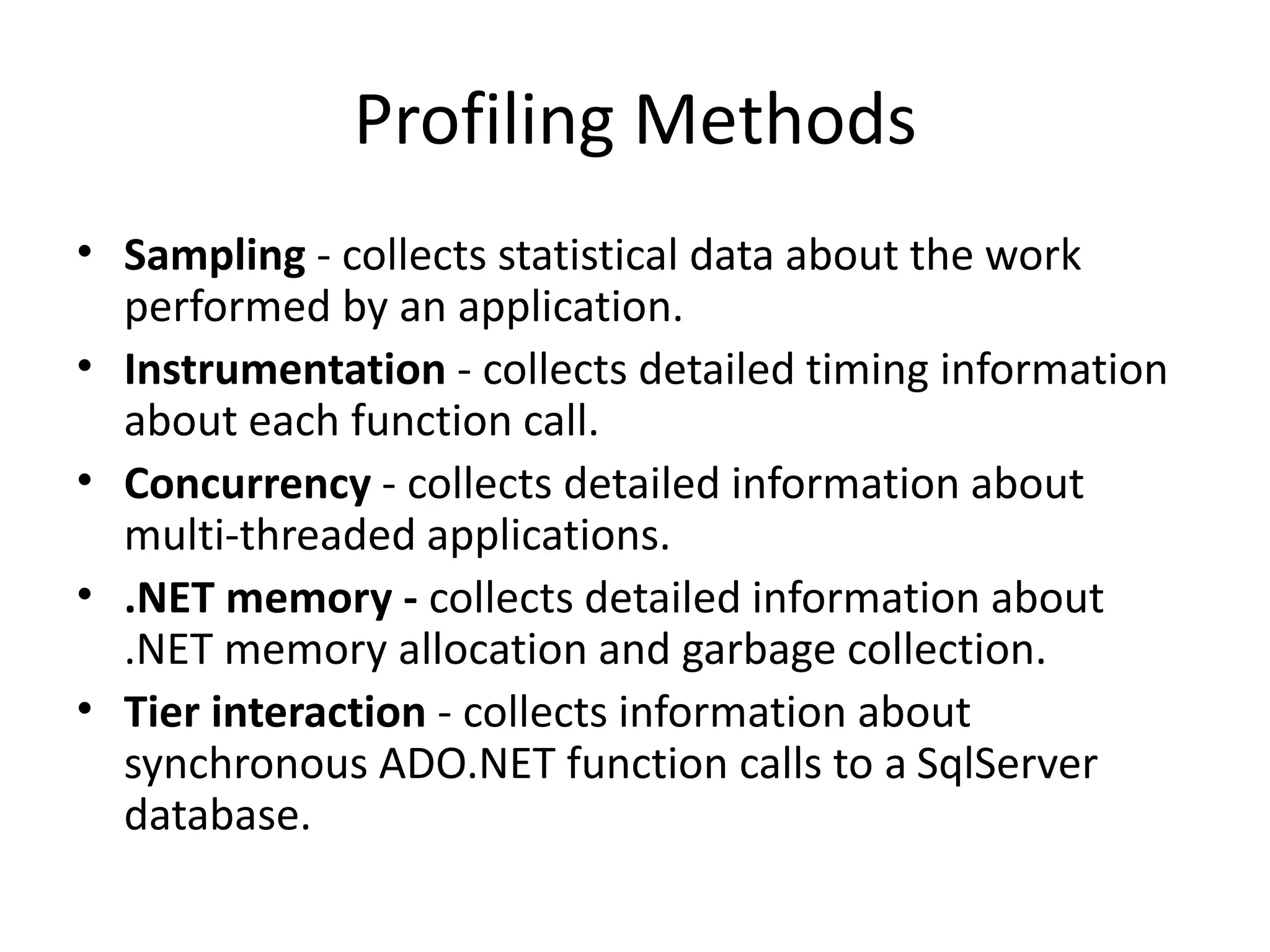 The document discusses various performance profiling methods including sampling, instrumentation, concurrency profiling, .NET memory profiling, and tier interaction profiling. It describes the values and views provided by each method. Sampling collects statistical data and is lightweight, while instrumentation collects detailed timing information for function calls. Concurrency profiling collects information about threads and blocking events. .NET memory profiling interrupts on object allocations and garbage collection to collect allocation data. The general profiler views include summary, call tree, modules, caller/callee, functions, .NET memory, object lifetime, and thread details views. Examples demonstrate using the views to identify performance issues and improvements.