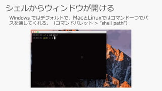 オープンソースの無料のエディタ • マイクロソフトが開発 • マルチプラットフォーム • 軽量!(起動早いし動作も軽い!) • とにかくプラグインがたくさん!!