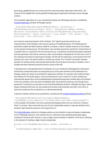 This document discusses the integration of custom user tool windows into the Visual Studio IDE, detailing the processes of window registration, initialization, and event handling for extensions. It covers the creation of both single-instance and multi-instance tool windows, explaining how to implement and manage them through VSPackage and add-in modules. It also highlights the importance of user interface context and provides examples of handling window events and user controls within the tool windows.