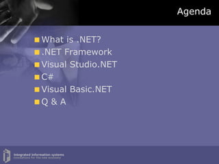 The document provides an introduction to Visual Studio.NET and the .NET framework. It discusses what .NET is, the core components including the .NET framework and common language runtime. It also summarizes the main languages - C# and Visual Basic.NET - and tools in Visual Studio.NET for developing .NET applications.