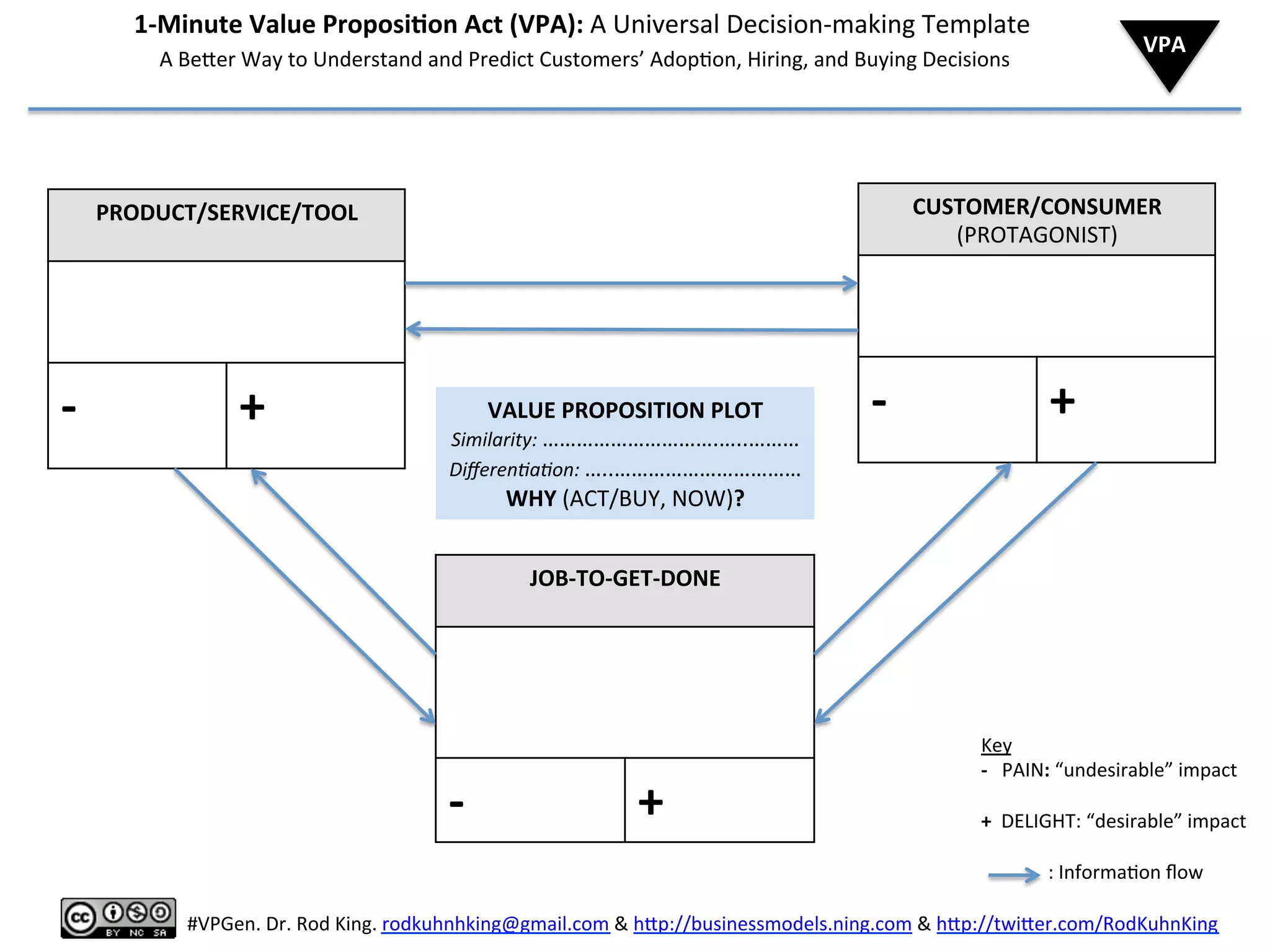The document outlines the 1-Minute Value Proposition Act (VPA), a template for understanding customer adoption and decision-making regarding products and services. It includes checklists and questions aimed at identifying customer needs, evaluating competitors, and optimizing value propositions based on pain and delight factors. Additionally, it discusses the Value Proposition Canvas as a subset of the VPA to better align products with market demands.